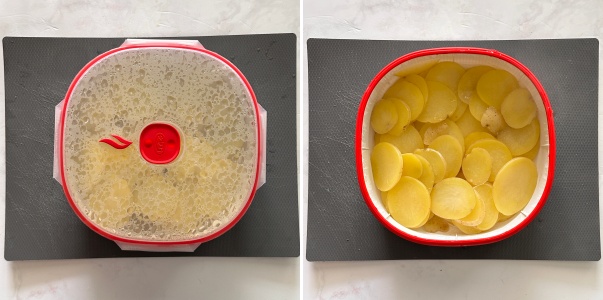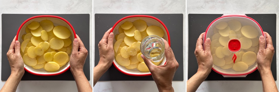 Depois de cortar as batatas, distribua no recipiente para cozimento a vapor e adicione 100 ml de água no fundo. Feche com a tampa, deixando a válvula aberta e coloque as batatas no micro-ondas. Cozinhe por 10 minutos a 800 watts.