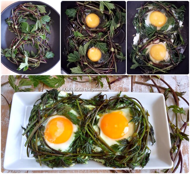A mesma receita preparada com os AGRETTI ou os ASPARAGOS SELVAGENS, requer um pré-cozimento das ervas selvagens, antes de formar os ninhos na frigideira.