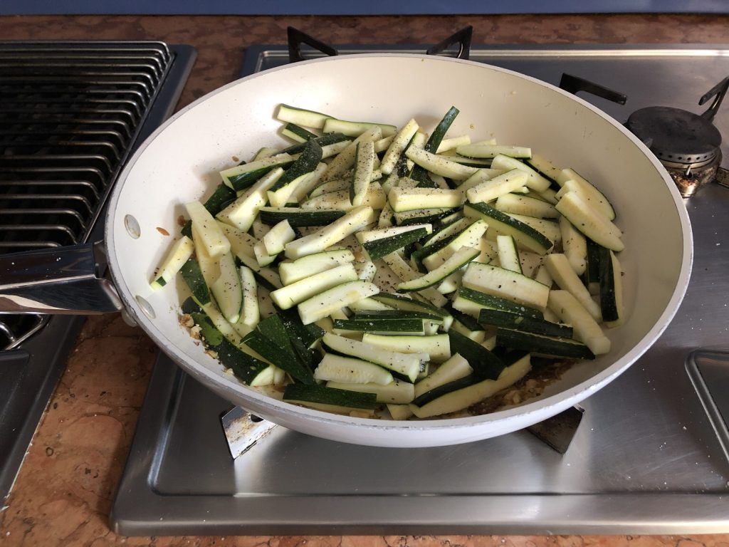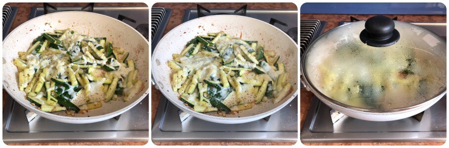 Quando a abobrinha estiver macia, mas ainda crocante, adicionar a scamorza e o queijo ralado. Colocar a tampa para derreter bem os queijos.