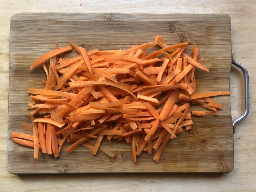 • Descasque e apare as cenouras, lave-as, seque-as com papel-toalha e corte-as em palitos finos. Não as rale em julienne com um ralador de furos grandes, porque na cocção ficariam muito moles; ao invés disso, fatie e faça palitos.