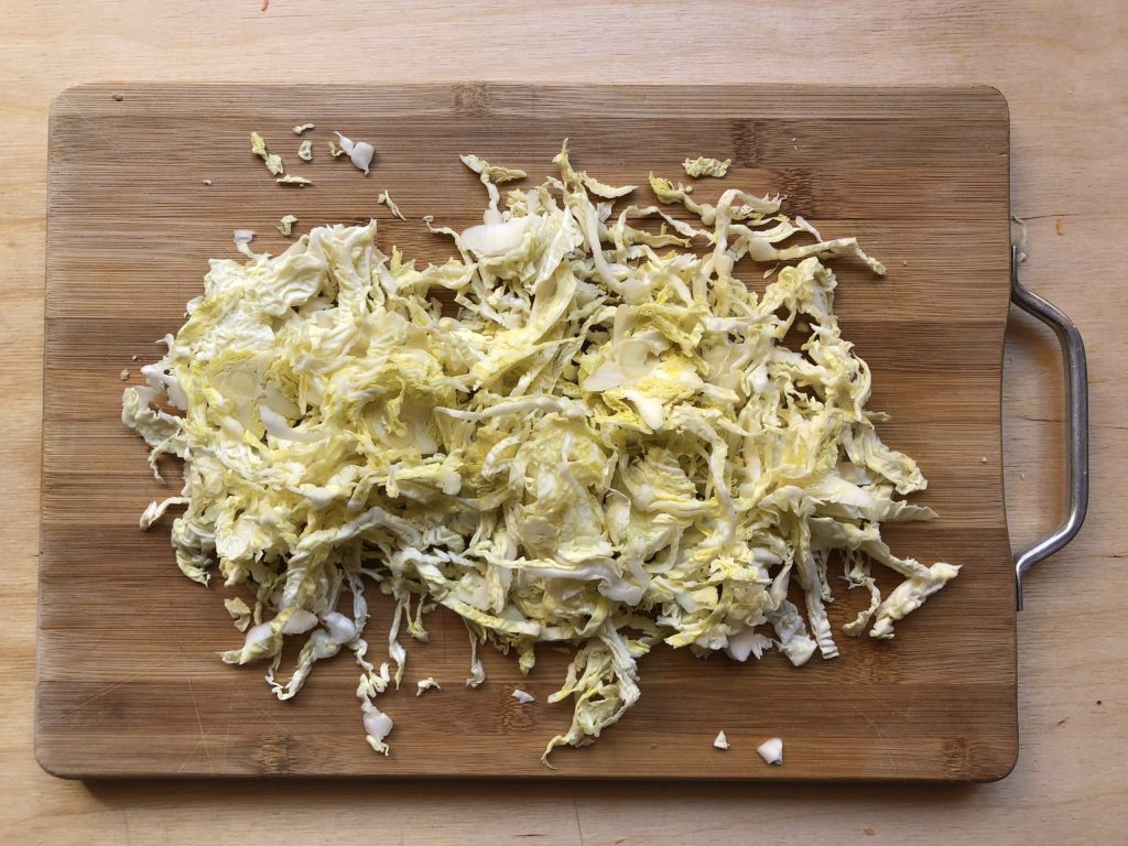 • Corte o repolho finamente. Eu usei a fatiadora, mas uma faca funciona perfeitamente.