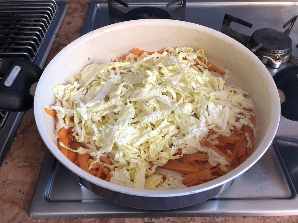 • Em seguida, adicione o repolho e continue o cozimento por mais 4 minutos, mexendo frequentemente. Os vegetais devem ficar secos e as cenouras ainda levemente crocantes.