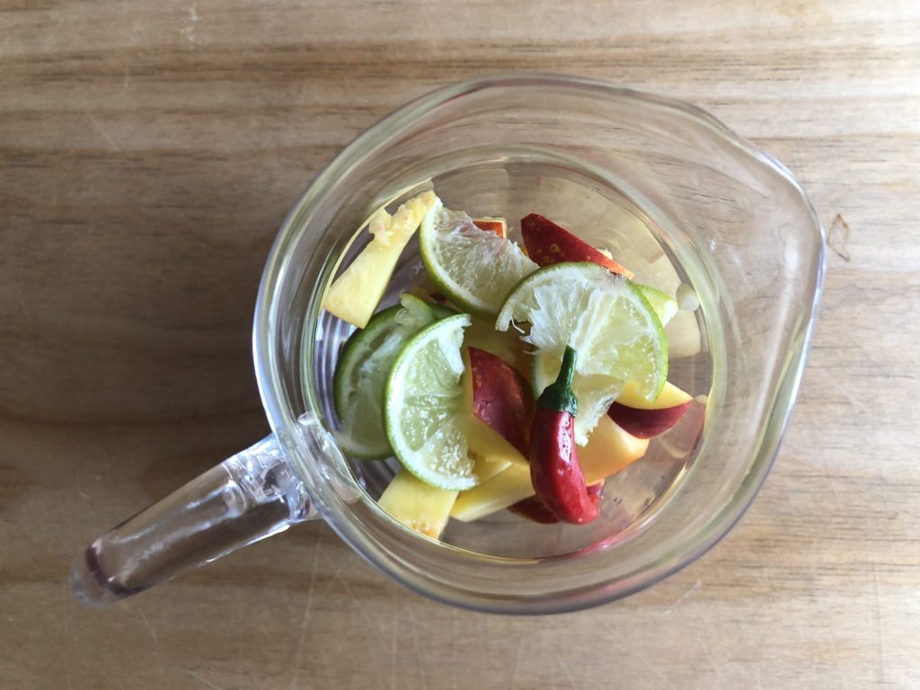 Não jogue fora as frutas usadas para preparar esta água aromatizada. Coma o pêssego tranquilamente (eu sempre faço isso). Só não recomendo a pimenta! Quanto à lima, geralmente espremo um pouco as fatias na água, mas se você não gostar, não precisa fazer isso.
