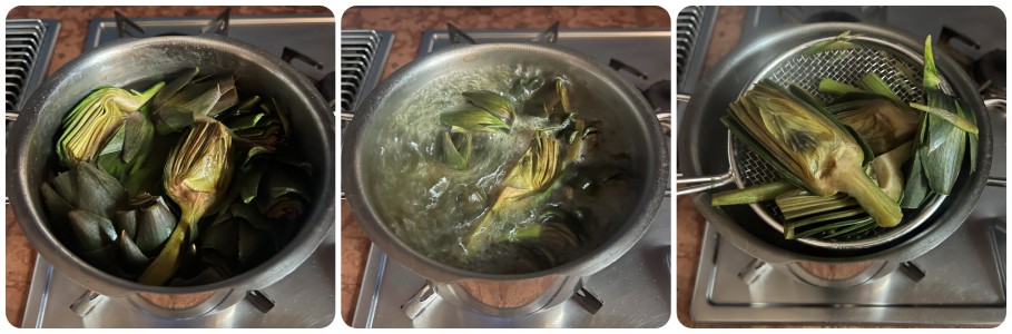 • Limpe as alcachofras, removendo as folhas externas mais duras e as pontas, e corte-as em gomos. As minhas não eram muito grandes, então cortei em quartos. Lembre-se de remover o miolo (o “feno”) se houver. E não jogue os talos fora — são uma delícia. Remova a parte externa fibrosa com um descascador e corte-os em rodelas ou palitos. Depois cozinhe-os junto com as alcachofras (mesmo branqueamento, mesma panela). Em casa são sempre os primeiros a desaparecer!!!