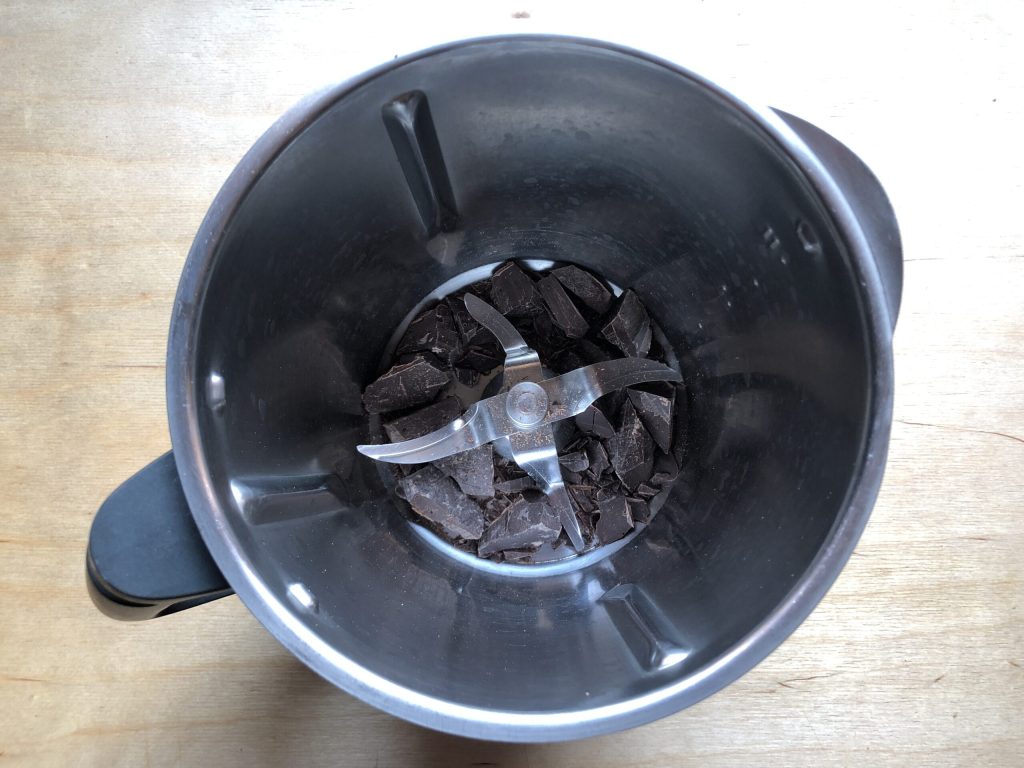 • Corte o chocolate amargo em pedaços, coloque-os no copo do liquidificador e triture finamente (10 segundos na velocidade 8).