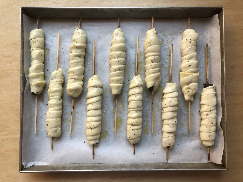 Enrole uma tira de focaccia em cada arrosticino, cobrindo totalmente e selando as extremidades.