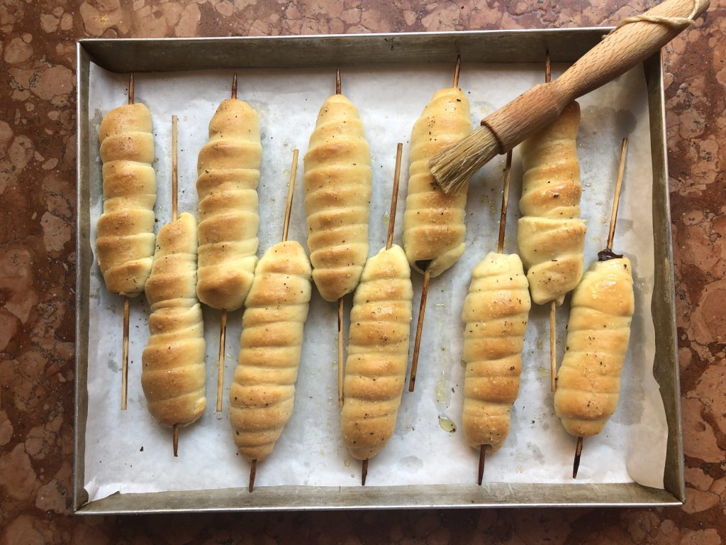 Arrume os arrosticini, à medida que for fazendo, numa assadeira forrada com papel manteiga e pincele os rolinhos de focaccia com a mistura preparada.