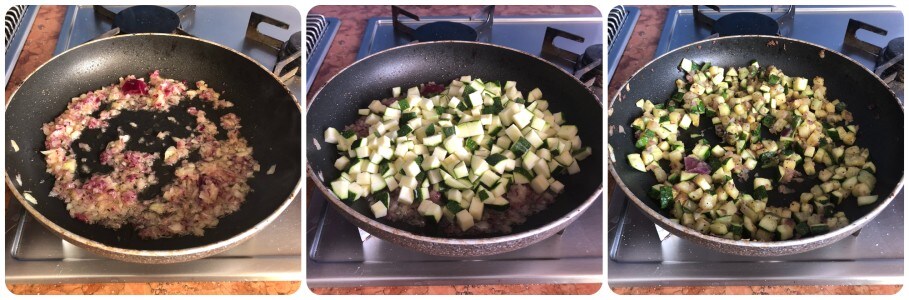 Em uma frigideira de tamanho médio, aqueça uma colher de azeite e refogue a cebola picada finamente. Deixe fritar por alguns instantes, depois adicione as abobrinhas e doure em fogo médio por 6/7 minutos, mexendo frequentemente. Ao final do cozimento, adicione sal e pimenta a gosto.