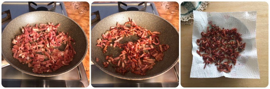 Corte as fatias de speck em pedaços pequenos, depois doure em uma frigideira pequena com um fio de azeite até que fiquem dourados e crocantes. Depois, transfira para papel toalha e seque para remover o excesso de gordura.