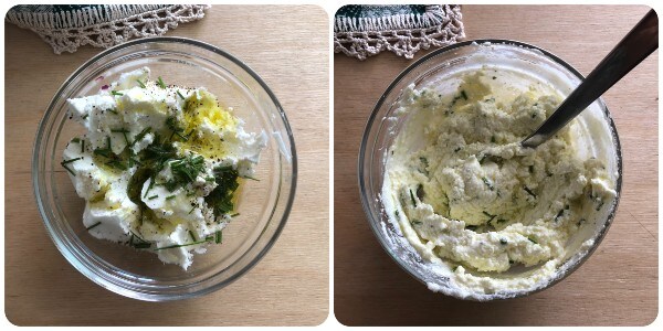 Em uma tigelinha, misture a robiola com a cebolinha cortada com a tesoura, uma pitada de sal, uma boa quantidade de pimenta preta moída e 25 ml de azeite.