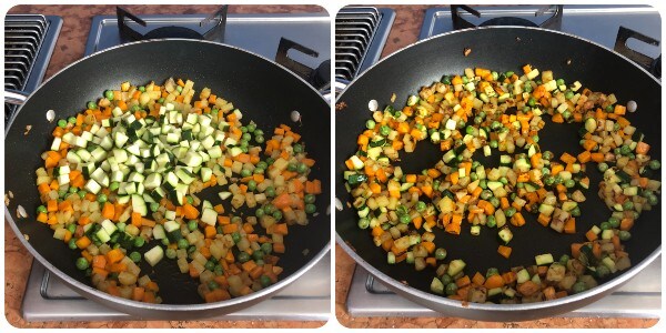 Por fim, adicione também as abobrinhas e continue cozinhando por mais 5 minutos sempre mexendo frequentemente. Somente no final, tempere com sal e pimenta a gosto.