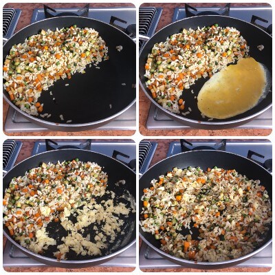 Agora, mova o arroz e os legumes para um lado da frigideira e despeje o ovo batido no espaço restante. Misture rapidamente com uma colher de pau e, quando estiver bem cozido, misture com todos os outros ingredientes.