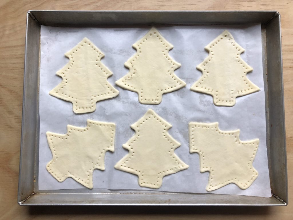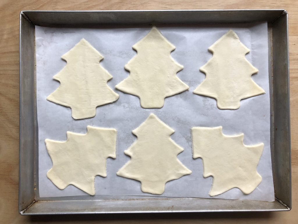 Com um cortador em forma de árvore, corte as árvores de folhado. Com meu cortador, eu cortei 6; tem 12 cm de altura e mede 12 cm na parte mais larga.