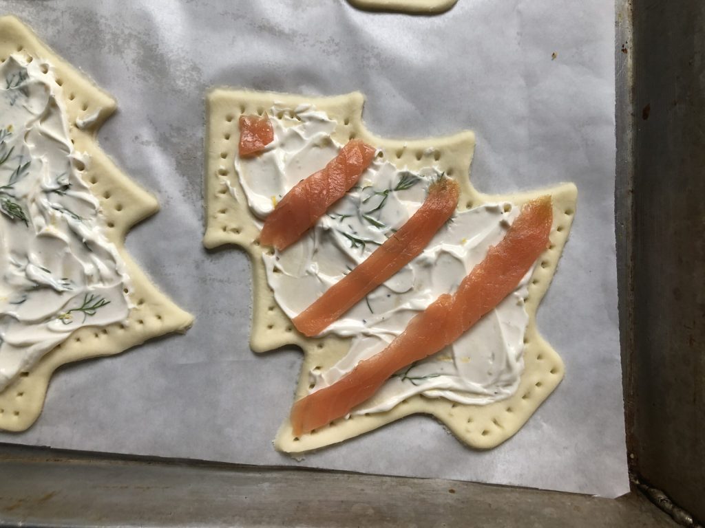 Com a tesoura, corte tiras da fatia de salmão e coloque-as nas árvores conforme mostrado na foto. Devem dar a ideia de decoração natalina.
