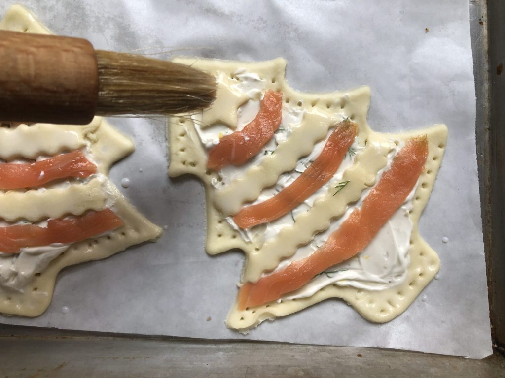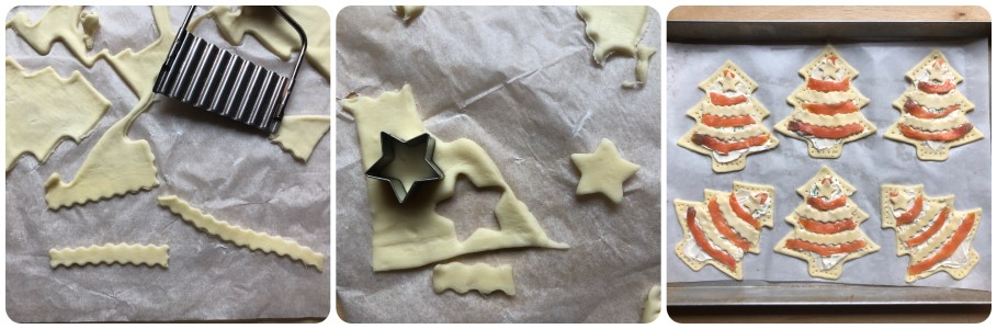 Agora, retire também os recortes de massa folhada da geladeira e corte pequenas guirlandas. Eu usei um cortador de batatas para obter o efeito ondulado. Se você não tiver, pode encontrar online clicando AQUI. Coloque essas guirlandas nos espaços entre uma tira de salmão e outra. Em seguida, corte dos recortes 6 pequenas estrelas e posicione-as no topo de cada árvore.