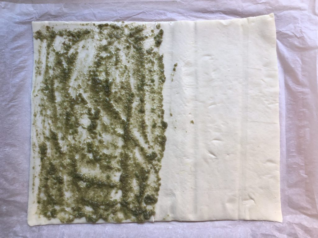 Desenrole o retângulo de massa folhada mantendo-o sobre o papel fornecido na embalagem, depois espalhe metade com patê de azeitonas verdes (você pode usar também o de azeitonas pretas, que talvez seja mais fácil de encontrar).