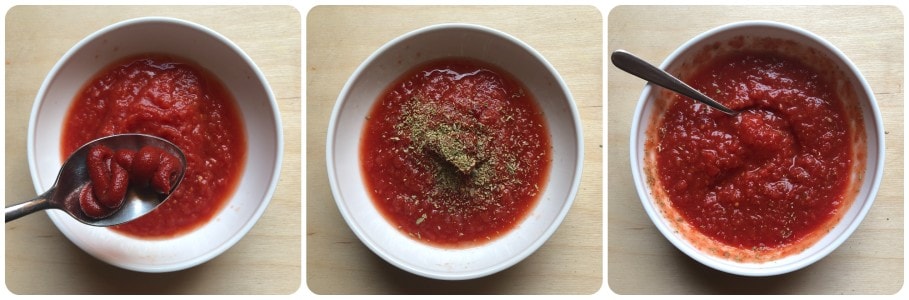 Coloque a polpa de tomate em uma pequena tigela. Adicione uma colher de extrato de tomate, uma pitada de açúcar, uma generosa pitada de sal e orégano. Misture bem e reserve.