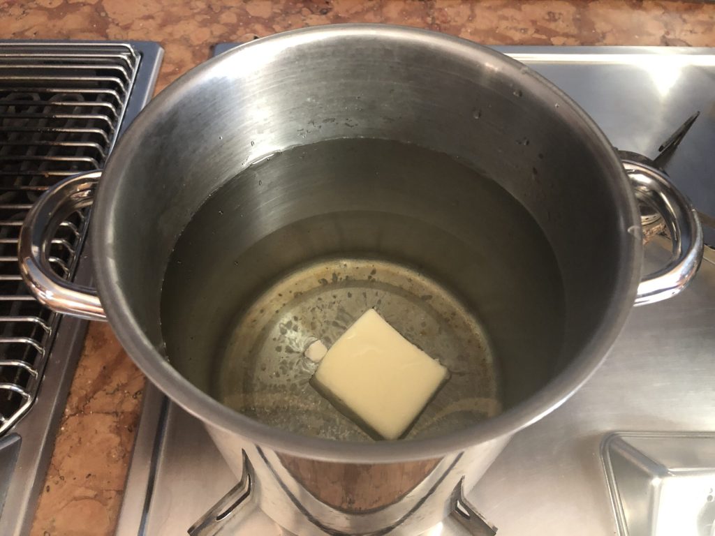 Despeje bastante água em uma panela para aspargos (ou uma panela alta e estreita), adicione sal, depois adicione o açúcar e a manteiga e leve para ferver.