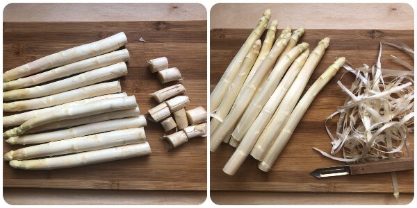 Enquanto isso, limpe os aspargos brancos removendo a parte mais lenhosa da haste.