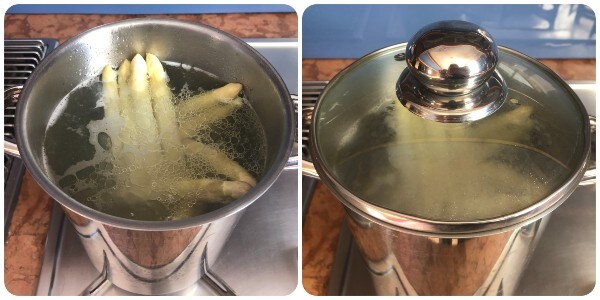 Quando a água ferver, mergulhe os aspargos tentando manter as pontas fora da água, coloque a tampa e cozinhe por cerca de dez minutos. Verifique a cozedura com um garfo, pois o tempo depende muito também do tamanho dos seus vegetais.