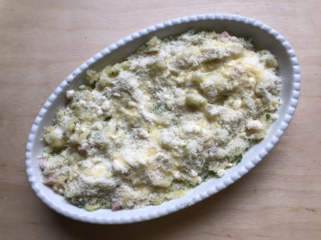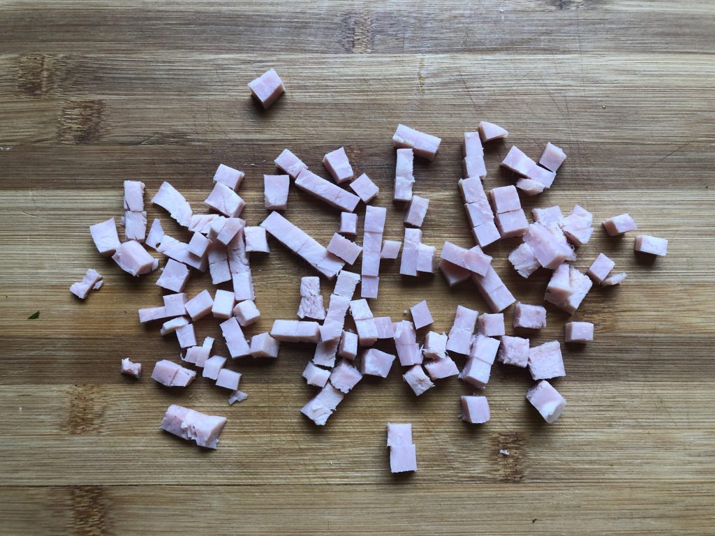 Em seguida, adicione 20 g de manteiga em pedaços, a mistura de cebola e salsinha e o presunto cozido em cubos.