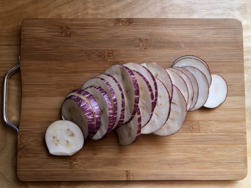 Corte as pontas, lave e corte em fatias de cerca de ½ cm de espessura.