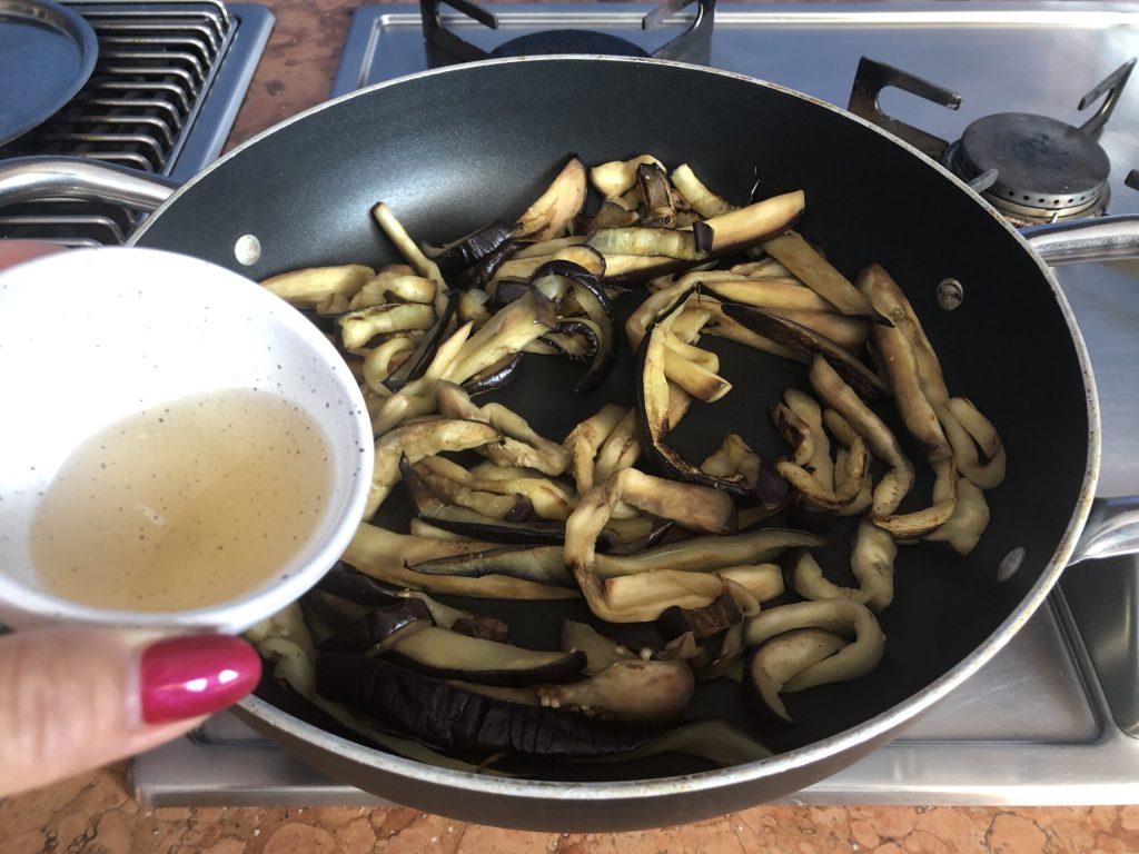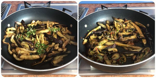 Em seguida, despeje sobre as berinjelas a mistura de alho e salsinha e deixe apurar em fogo baixo por alguns minutos.