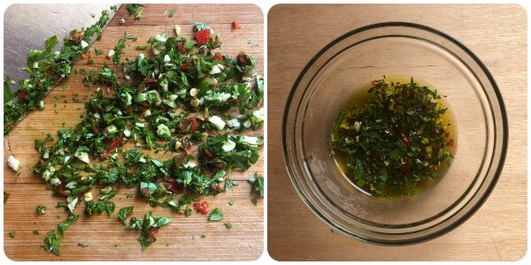 Enquanto isso, descasque um dente de alho, remova o miolo central e pique-o junto com a salsinha e uma pimenta fresca pequena. Eu usei uma mezzaluna. Em seguida, transfira a mistura para uma tigelinha e adicione algumas colheres de azeite. Reserve.