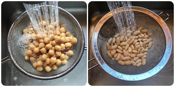 Escorra o grão-de-bico e os feijões cannellini do líquido de conservação e enxágue-os bem em água corrente fria.