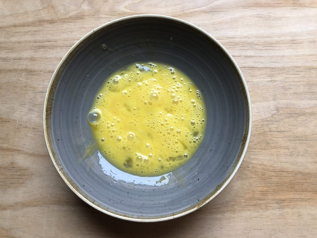 • Enquanto a massa descansa, quebre um ovo em uma tigelinha e bata com um garfo apenas o tempo necessário para misturar a gema e a clara.