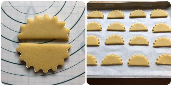 • Corte ao meio cada círculo e disponha, à medida que avança, os biscoitos de leite em duas assadeiras forradas com papel manteiga.