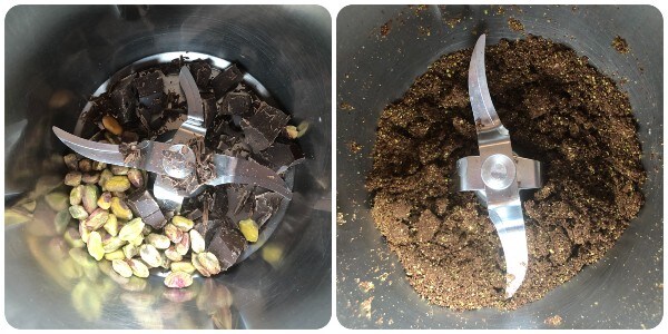 Coloque no copo o chocolate em pedaços e os pistaches e triture até obter um pó fino. Fiz a olho, triturando várias vezes na velocidade 5/6.