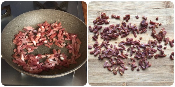 Aqueça bem uma frigideira pequena sem óleo e frite o speck até ficar dourado e crocante. Retire da frigideira, deixe esfriar totalmente e corte em pedacinhos com uma faca.