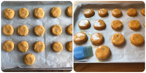 • Neste ponto, modele com as mãos bolinhas de 30 g cada, achate-as ligeiramente e disponha-as, uma a uma, em uma assadeira forrada com papel manteiga. Em seguida, pincele-as com azeite.