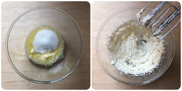 Coloque o açúcar em uma tigela junto com a manteiga amolecida e bata energicamente com a batedeira elétrica.