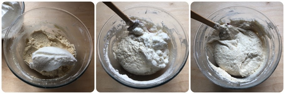 Quando esta última estiver perfeitamente incorporada à mistura, adicione as claras batidas em neve em três adições e incorpore-as com movimentos delicados de baixo para cima.