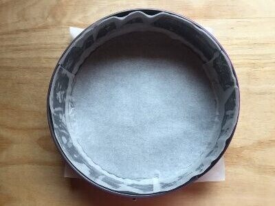 Primeiro, forre com papel manteiga uma forma de fundo removível com 22 cm de diâmetro e reserve. Para fazer isso da melhor forma, você pode seguir o procedimento descrito AQUI.