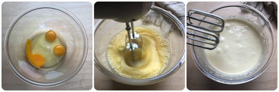 Em uma tigela grande, coloque os ovos com o açúcar e bata-os com os batedores elétricos até obter uma mistura clara e espumosa.