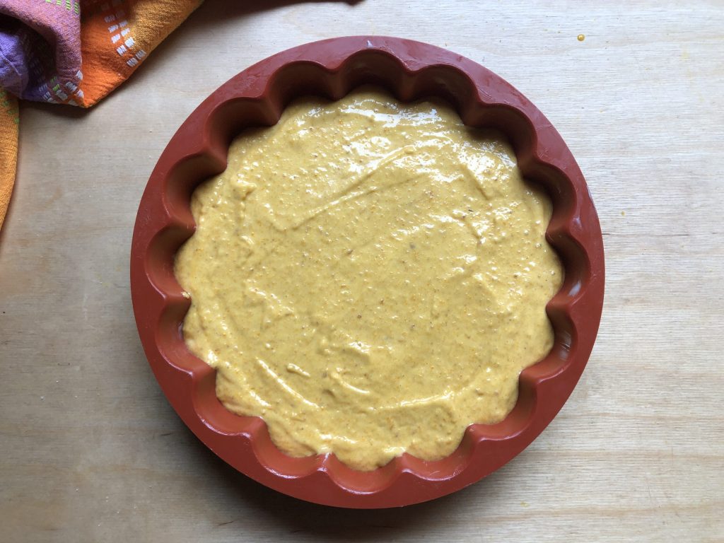 Obtida uma massa homogênea, despejá-la em uma forma de 22 cm de diâmetro previamente untada e enfarinhada. Eu usei uma forma decorada de silicone, mas a untei mesmo assim, embora não seja necessário. Sempre faço isso para garantir que não estrague o bolo e consiga desenformá-lo sem problemas. Nivelar a mistura com uma espátula.