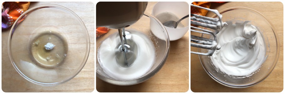Adicionar às claras uma pitada de cremor de tártaro e começar a batê-las em neve com a batedeira elétrica, acrescentando gradualmente duas colheres de açúcar retiradas do total. Deve-se obter uma espécie de merengue firme e brilhante. Reservar.