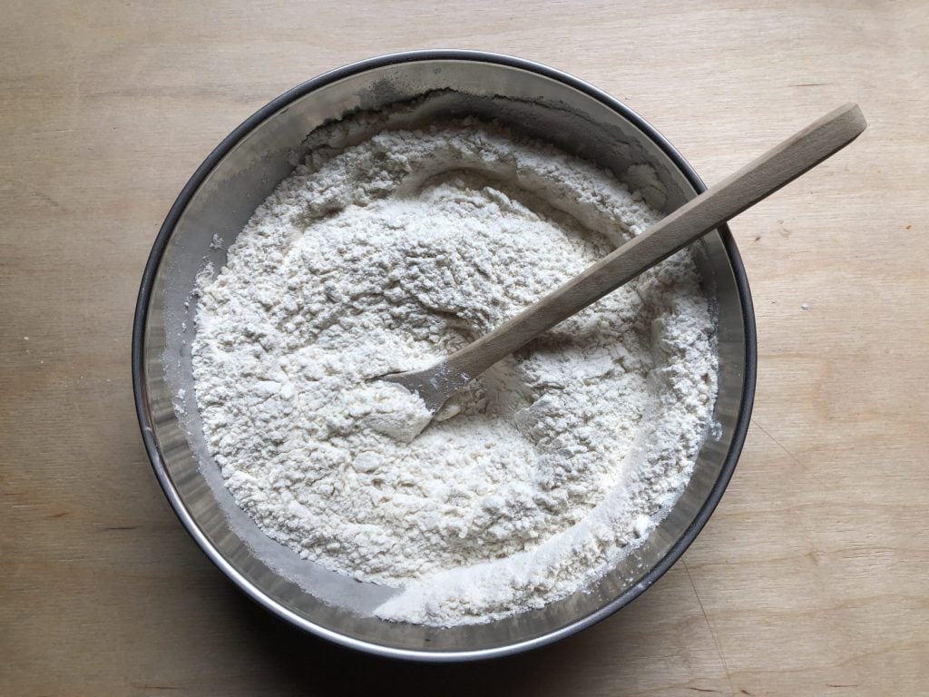 Adicione gradualmente os ingredientes secos peneirando-os através de uma peneira de malha fina e incorpore-os com o batedor.