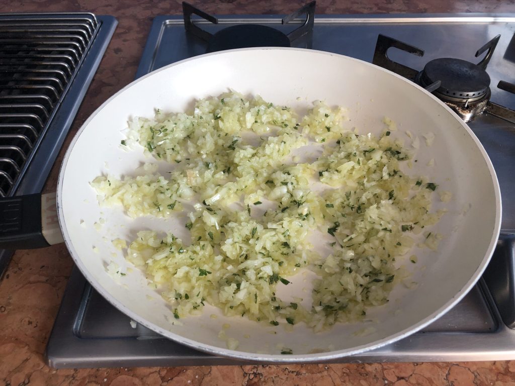 Aqueça um par de colheres de sopa de óleo em uma frigideira antes de adicionar a cebola e as ervas aromáticas. Salgue a gosto e cozinhe em fogo baixo por 5 minutos, mexendo com frequência.