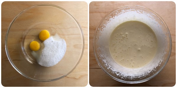 Em uma tigela, coloque os ovos com o restante do açúcar e bata com a batedeira elétrica até obter uma mistura clara e espumosa.