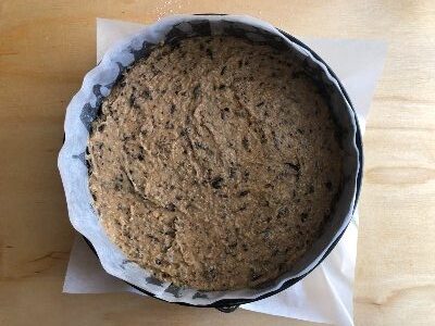 Transfira para uma forma de diâmetro de 24 cm previamente forrada com papel manteiga ou untada e enfarinhada.