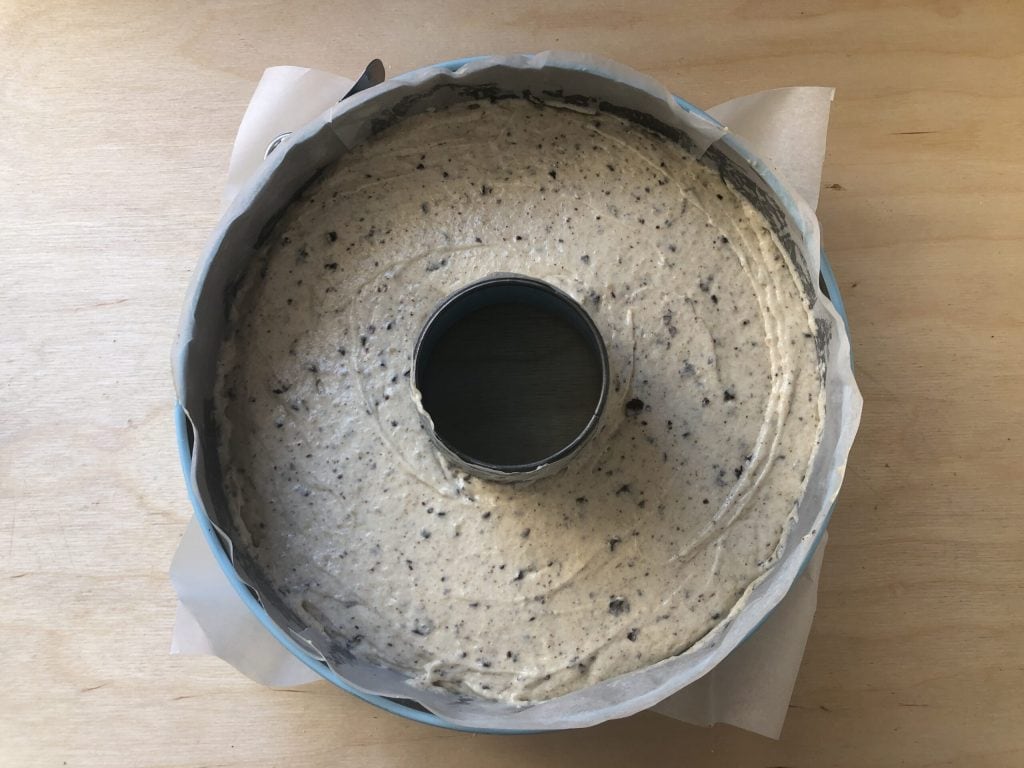 • Despeje a mistura obtida em uma forma de bolo com diâmetro de 26 cm previamente forrada com papel manteiga (encontre AQUI o procedimento para fazer isso da melhor forma) ou untada e enfarinhada e nivele bem com a espátula.