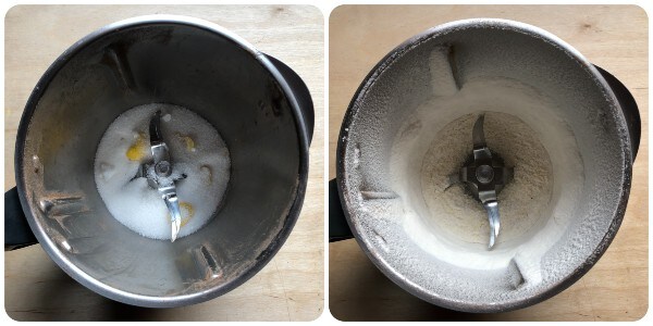 Retirar a casca de meio limão com uma faca ou descascador, procurando tirar apenas a parte amarela (lembro que é importante usar um limão orgânico não tratado já que a casca dos outros limões não é comestível), depois colocá-la no copo junto com o açúcar e triturar (15 seg. a vel. 9).