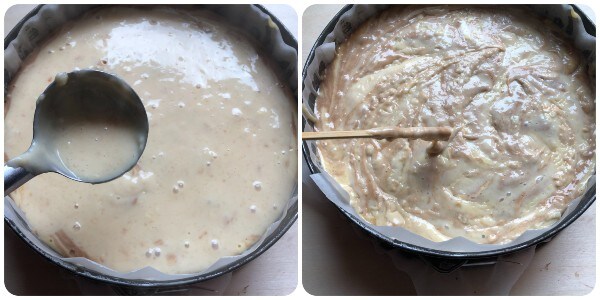 Despeje metade desta massa em uma forma de bolo com aro removível de 24 cm de diâmetro previamente forrada com papel manteiga e nivele bem.
