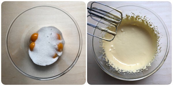 Adicione o açúcar às gemas e trabalhe com a batedeira elétrica até obter uma mistura clara e espumosa.