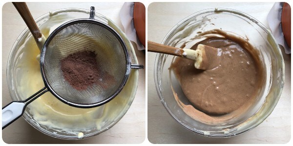 Adicione à massa restante o cacau em pó peneirando através da peneira e misture para incorporá-lo perfeitamente à massa.