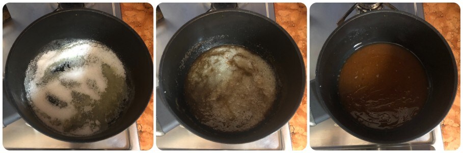 • Caramelize em fogo baixo sem mexer, apenas movimentando a panela: tenha muito cuidado, pois pode queimar facilmente.
